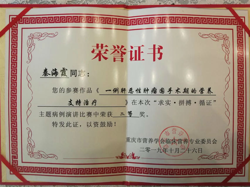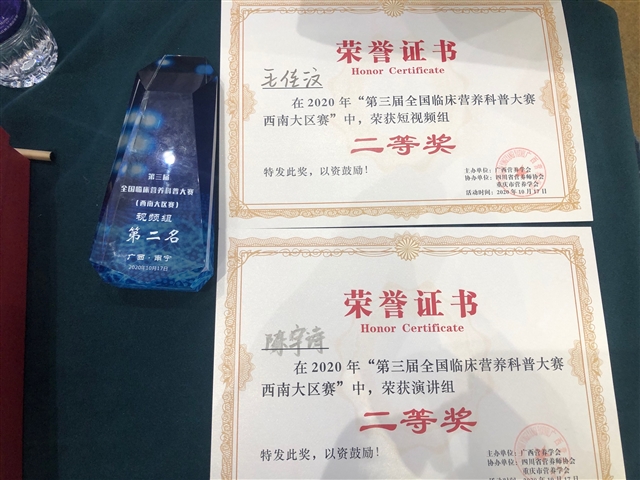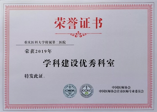 重庆医科大学附属第二医院临床营养科作为医技科室组建于2012年,目前科室共有9名工作人员,医师4名,营养技师4名,工勤人员1名,其中博士2名,硕士2名,本科4名,大专1名。主要开展业务包括:妊娠糖尿病营养治疗咨询门诊,慢性疾病营养咨询门诊、肥胖医学减重联合门诊,全院各临床科室营养不良患者的营养治疗方案拟定。目前以院内会诊为主要工作形式,形成了营养风险筛查、营养评估、拟定营养治疗方案、肠内营养制剂配制配送等一体化的临床营养工作体系。