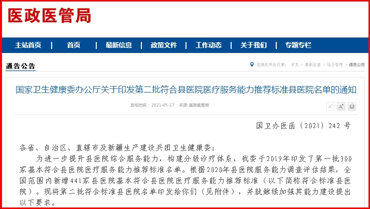 2021年5月17日,国家卫健委公布了全国第二批符合县医院医疗服务能力推荐标准名单,全国范围内新增441家基本符合县医院医疗服务能力推荐标准...