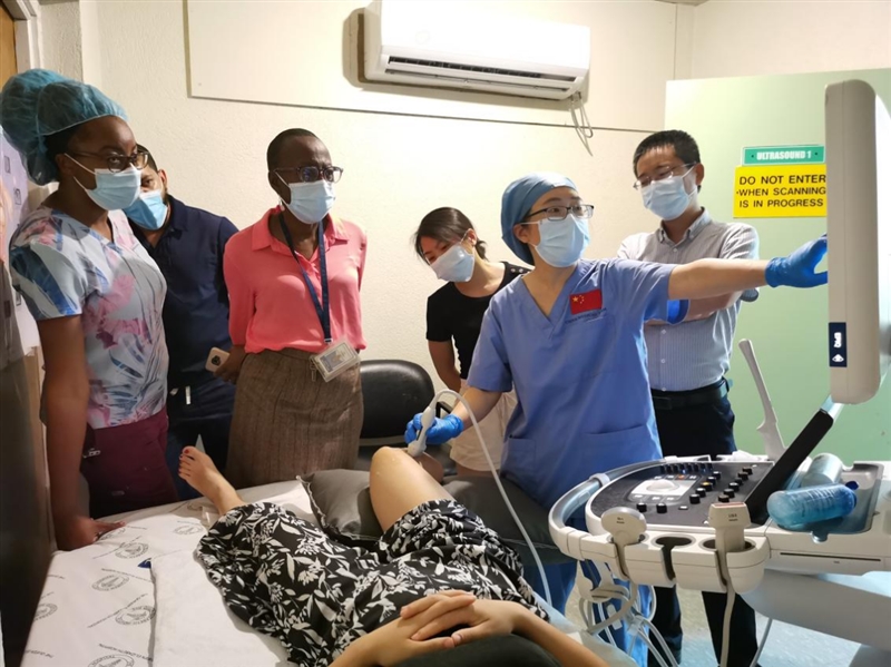 当地时间8月12日下午, 第5批中国援巴巴多斯医疗队超声科医生张群霞在受援医院QEH开展膝关节超声检查的操作培训,医院放射科高年资医生、...