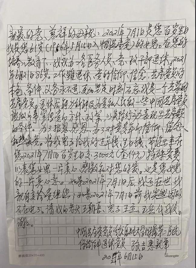 “亲爱的党,2021年7月1日是您百岁生日…工作虽退休,但党的信仰、信念永不褪色…我自愿向党组织交纳3000元特殊党费,献礼党的百岁华诞。”...