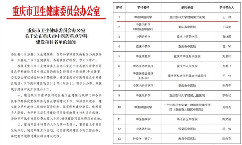 11月24日,重庆市卫生健康委正式公布“重庆市中医药重点学科建设项目名单”,重庆医科大学附属第二医院(以下简称“重医附二院”)中西医结合医学中心申报的“中医肿瘤病学”学科凭借其深厚的学术积淀、创新的诊疗模式及卓越的临床科研实力,成功入选。这标志着该院在中医药防治肿瘤领域的学科建设水平与临床科研教学实力获得权威认可。