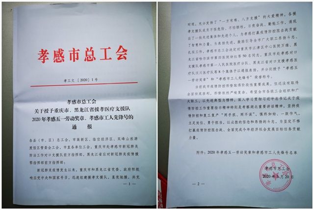 3月20日,湖北省孝感市总工会发布《关于授予重庆市、黑龙江省援孝医疗支援队2020年孝感五一劳动奖章、孝感市工人先锋号的通报》,重庆市第