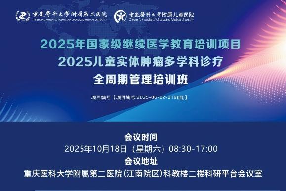 2025年国家级继续医学教育项目——“儿童实体肿瘤多学科诊疗全周期管理”培训班(项目编号:2025-06-02-019(国))将于2025年10月18日在重庆医科大学附属第二医院(江南院区)科教楼二楼科研平台会议室举行。