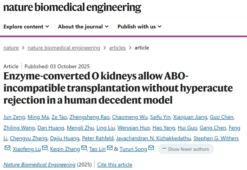 2025年10月3日,我国医学研究团队在世界顶级医学期刊《Nature Biomedical Engineering》(IF 26.6)发表最新研究成果,成功将A型肾脏经酶转化变为“通用O型”肾脏并成功移植给跨血型受者。