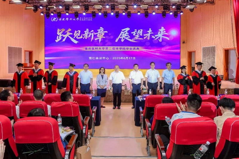 2025年6月17日下午,重庆医科大学附属第二医院江南院区宽仁会议中心青春飞扬,第二临床学院2025届毕业典礼在庄严的国歌声中启幕。学院党委书记、院长何大维携党政领导班子成员及教师代表,与865名身着学位服的毕业生(含本科480人、硕士330人、博士55人)、129名结业的住培医师及其亲友共襄盛典,见证新一代医者扬帆启航的历史时刻。典礼由院党委委员、副院长李兴升主持。