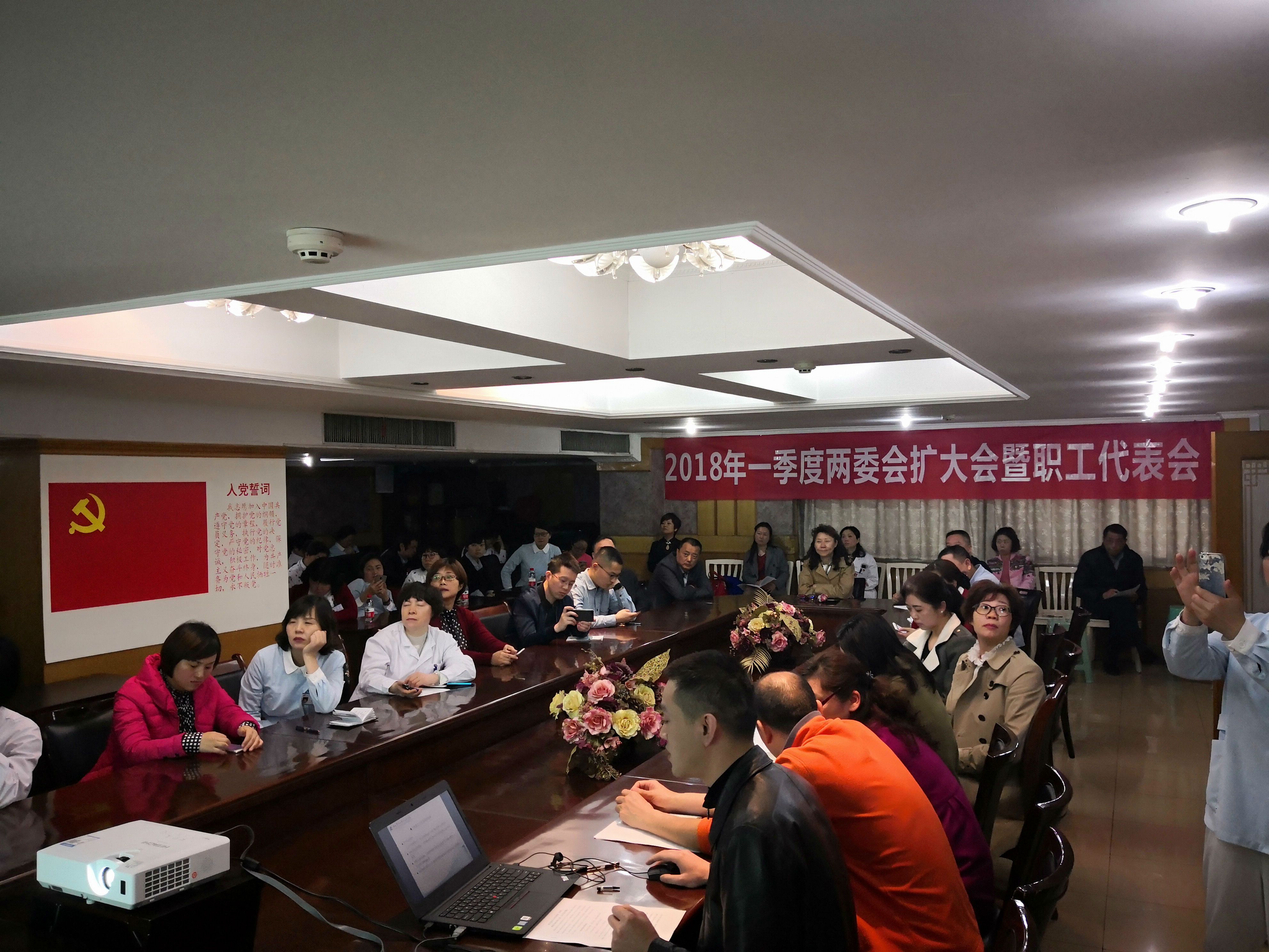 2018年3月21日上午,工会在蓝盾五楼会议室召开2018年一季度两委会扩大会暨职工代表会,听取和审议医院工作报告、工作计划、审计工作报告、预决算工作报告,听取工会相关工作报告,听取设备处、财务处等职能部门相关工作报告,进行院情通报。两委会委员、女工委员、工会组长、各代表组组长和部分职工代表参加会议。会议由工会主席杨力同志主持。