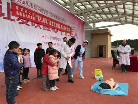 为弘扬雷锋精神,宣传普及急救技能,2018年3月7日上午,重庆医科大学附属第二医院巫溪分院的医护人员开展了“人人学急救,生命更长久”主题活动,利用专业知识为巫溪县思源实验中学的九百多名师生进行了心肺复苏、溺水急救、气道梗阻急救、狗咬伤等急救技能的现场培训。