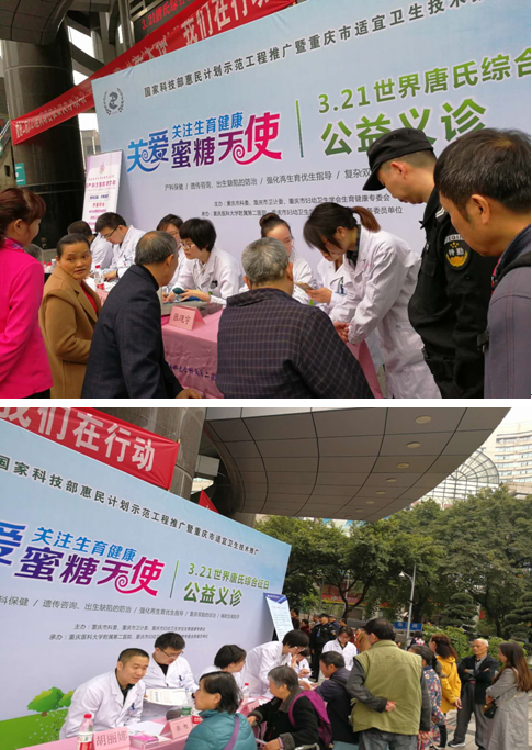 2018年3月21日是世界唐氏综合征日,重医附二院产科为了提高公众对唐氏综合症的认识,提升产前筛查的认知与意义,减少唐氏儿的出生,积极响应重庆市科委、卫计委的号召,当天上午在医院外科楼门口举办了“关爱‘蜜糖天使’我们在行动”主题义诊活动。妇产科主任胡丽娜教授,产科主任董晓静教授,生殖医学中心主任张觇宇教授等11名医护人员参与了本次义诊活动,呼吁大家关注唐氏综合征,关注生育健康。