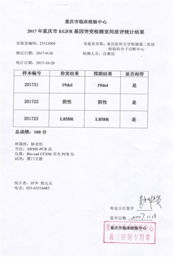 我院检验科分子诊断中心以优良成绩通过了PQCC于2017年开展的《分子诊断实验室质量管理》的KRAS,BRAF质控项目以及重庆市临床检验中心的EGFR
