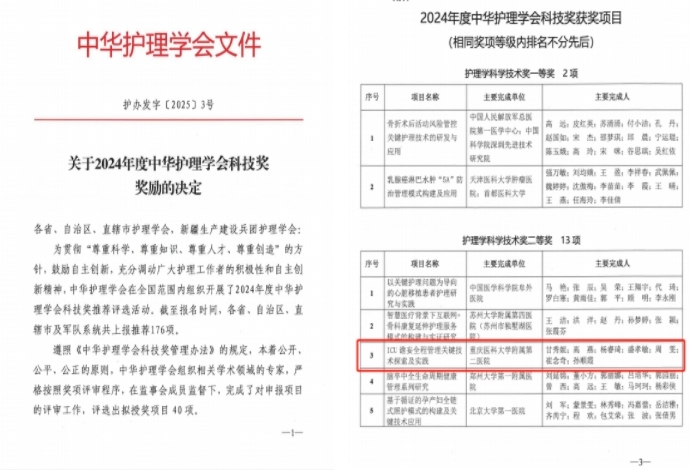 2025年2月10日,中华护理学会正式公布2024年度科技奖获奖名单,重庆医科大学附属第二医院护理部学科主任、循证护理研究中心主任甘秀妮教授团队主持的《ICU谵妄全程管理关键技术探索及实践》项目荣获二等奖,这是继2021年以来,甘主任团队在急危重症护理领域长期深耕,再次获此殊荣,并突破了新高度。