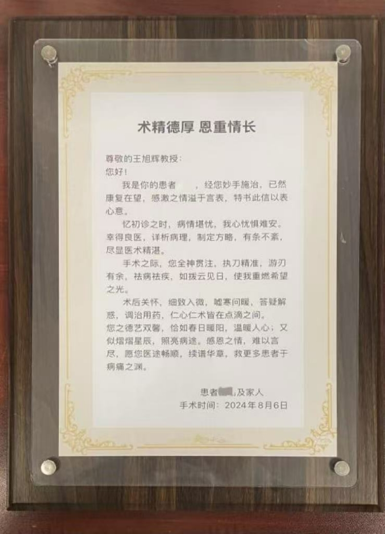 “尊敬的王旭辉教授:您好!我是你的患者小林(化名),经您妙手施治,已然康复在望,感激之情溢于言表,特书此信以表心意……”日前,重庆医科大学附属第二医院神经外科主任医师王旭辉教授收到一封感谢信,写信的是一名罕见嗅神经母细胞瘤患者。再次看到曾经病情堪忧的颅底肿瘤患者在成功接受他的手术后即将治愈,致力于打破学科壁垒的“跨界”颅底外科专家王旭辉非常感慨,他表示将持续探索多学科合作模式,帮助更多“三不管”地
