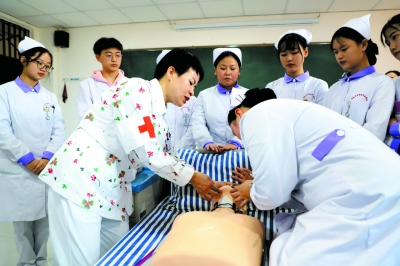 甘秀妮为学生开展急救公益培训。受访者供图/ 人物小传 /甘秀妮,重庆医科大学附属第二医院护理部主任。2010年,甘秀妮提出“全人、全程、全心”的护理理念,在她的带领下,重医附二院护理学科进入中国医院科