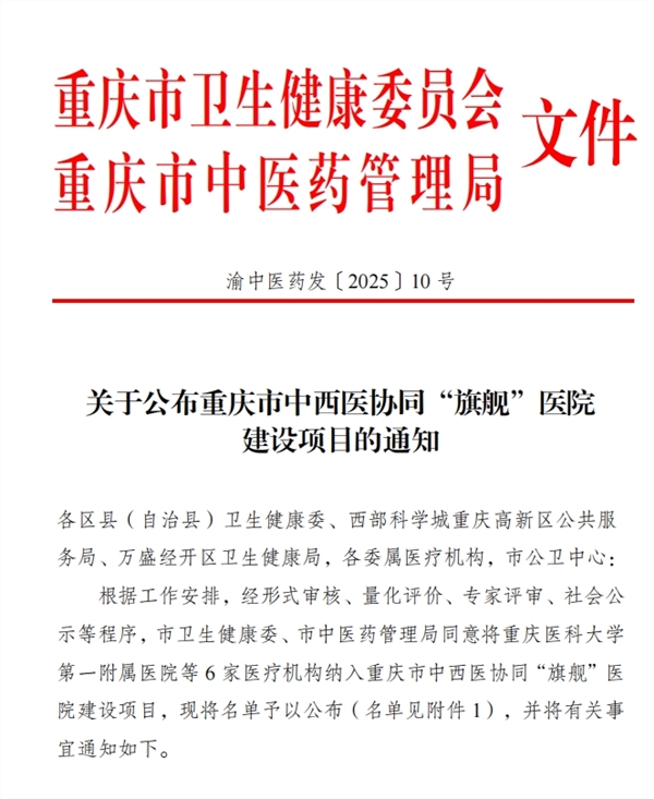 近日,重庆市卫生健康委与重庆市中医药管理局联合公布了重庆市中西医协同“旗舰”医院建设项目名单,重庆医科大学附属第二医院(以下简称“重医附二院”)凭借其中西医结合领域的深厚积淀与创新实践成功入选。这标志着该院在推动中西医深度融合、服务区域健康发展的道路上迈出新步伐,其建设模式与成效获得了高度认可。