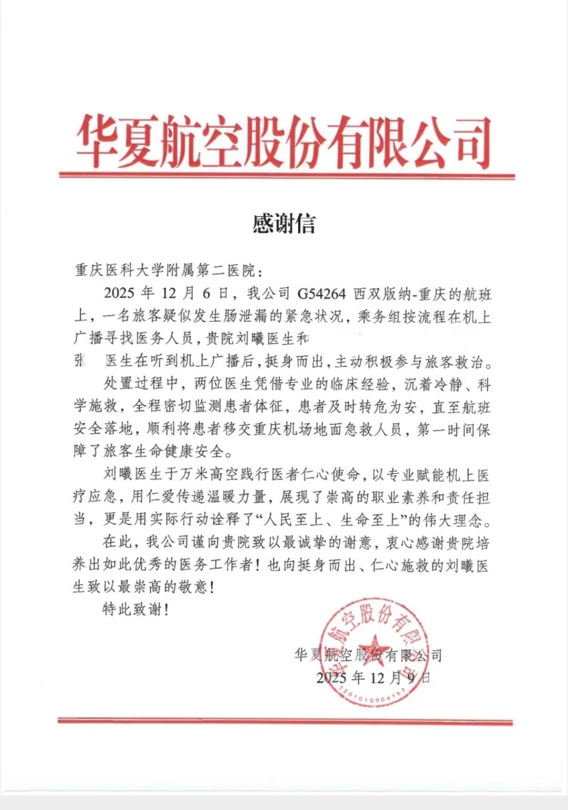 “机上有乘客突发身体不适,急需医务工作者到机舱后排!”12月6日下午,一趟从西双版纳飞往重庆的航班正在万米高空平稳飞行,急促的客舱广播突然打破了平静。很快,重庆医科大学附属第二医院放射科介入中心刘曦副教授立即起身向后排赶去,最终联合机组人员争分夺秒急救,成功守护乘客生命安全。