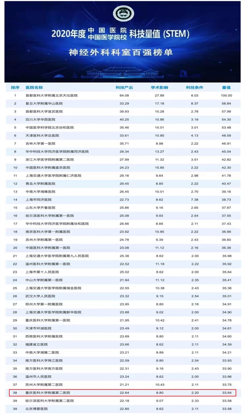 近日,由中国医学科学院主办的2020年度中国医院科技量值与2020年度中国医学院校科技量值(STEM)发布会在京举行。在神经外科学专科排行榜单...