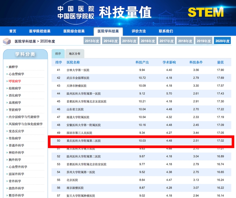 近日,由中国医学科学院主办的2020年度中国医院科技量值与2020年度中国医学院校科技量值(STEM)发布会在京举行。在呼吸病学科专科排行榜单...