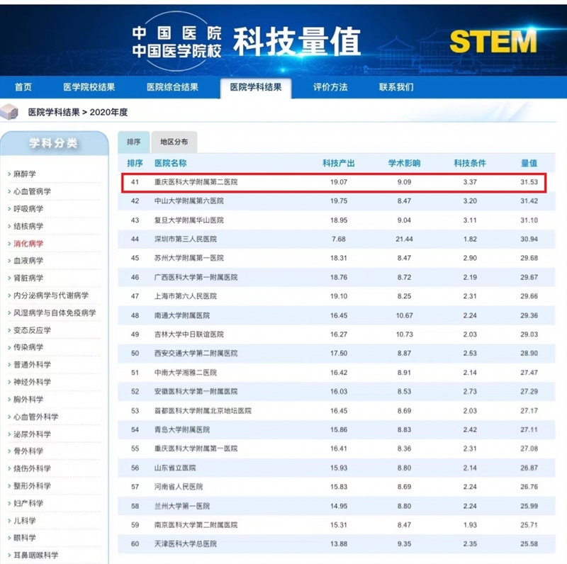 近日,中国医学科学院发布2020年度中国医院与中国医学院校科技量值(STEM)。在消化病学专科排行榜单上,重庆医科大学附属第二医院消化内科...