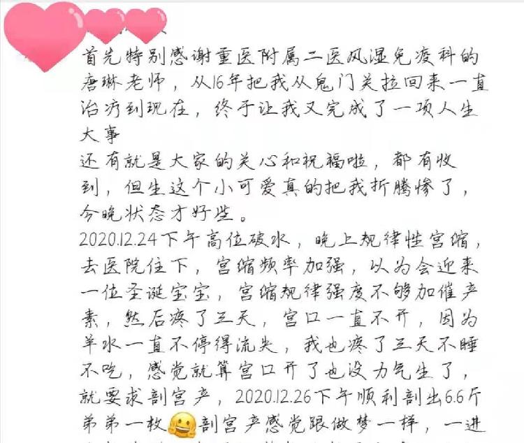 2020年12月28日,是莎莎在重医附二院生下孩子的第三天,望着躺在婴儿床里的“小可爱”,她喜极而泣,写下了一封情意满满的感谢信。这封信是