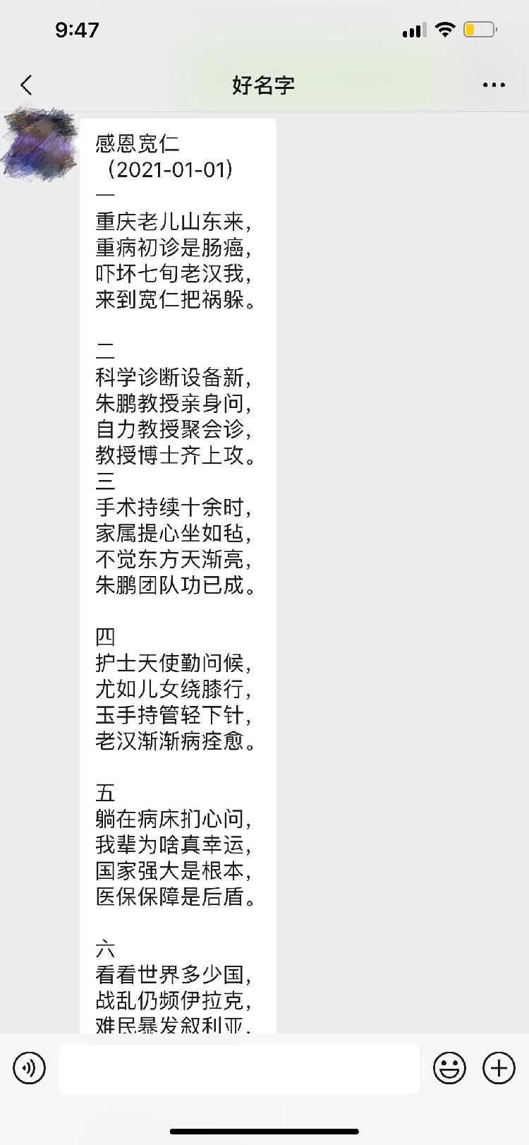2021年1月1日,重庆医科大学附属第二医院胃肠肛肠外科副主任朱鹏教授收到了一份特别的新年礼物——一首长长的感谢诗。当中写道:“重庆老儿