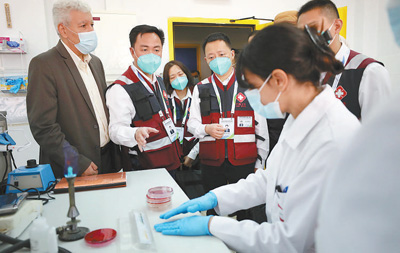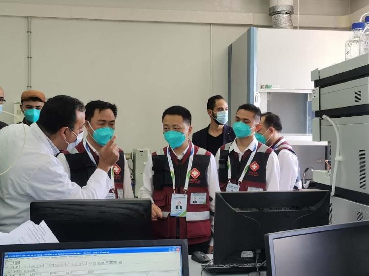 图为6月14日,中国赴巴勒斯坦抗疫医疗专家组考察巴卫生部下属的中央公共卫生实验室,并与巴方专家就新冠病毒检测和治疗方法进行交流。新华