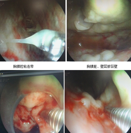 8月17日,于局麻下行胸腔镜术,内镜经右侧腋中线第七肋间隙交汇处进入,胸膜腔内见少许淡黄色胸水,脏层及壁层胸膜可见广泛黄白色脓苔覆盖,脏层和壁层胸膜见粘连带,首先行粘连带松解术,再反复用活检钳对苔壁进行钳夹、回吸,充分吸引脓性分泌物,其后再用2%碳酸氢钠对处理后的苔壁进行冲洗,回吸冲洗液体。整个过程约40分钟,胸膜腔粘连带及脓胸苔壁得到较好的清理。