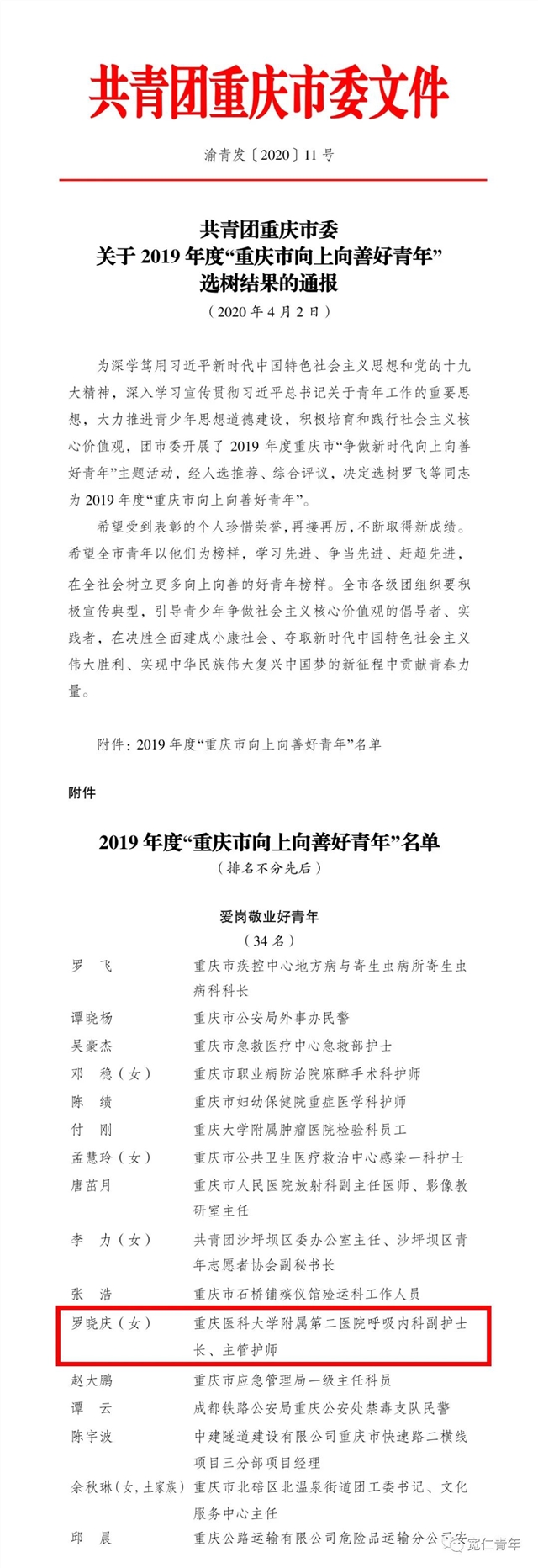 近日,团市委开展了 2019 年度重庆市“争做新时代向上向善好青年”主题活动。我院呼吸内科副护士长罗晓庆被选树为2019 年度“重庆市向上向善好青年”。