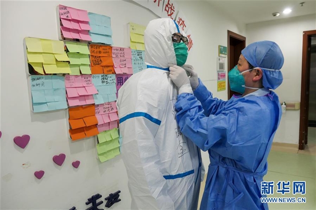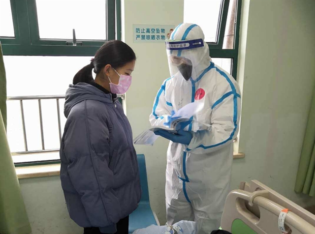 上海市第四人民医院门急诊总护士长戴爱兰(右)在为医护人员进病房前做防护把关。