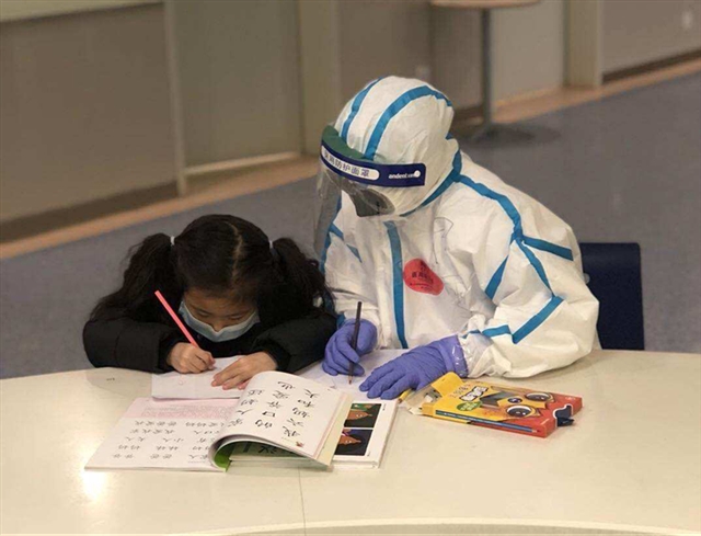 ——武汉儿童医院内科楼18楼是确诊新冠肺炎患儿病区。住在这里的孩子身旁没有家人,有的躺在床上玩手机,一看就是大半天。陪护团的“临时爸妈”们看在眼里,急在心里:这样不仅损害视力,而且也不利于康复,还会落下学业。“临时爸妈”们一商量,又充当起了孩子们的“临时老师”:早上做完治疗后,10点左右带孩子们做操锻炼身体;下午治疗和午休后,3点开始学习。33岁的护士、“临时老师”张勇说:“孩子们这么小就遭这个罪,我们能帮一点就是一点。希望孩子们出院时,不至于落下太多功课,往后健健康康成长!”