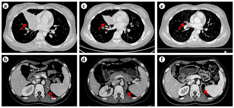 根据事先制定好的治疗方案,杨镇洲教授团队先后为患者进行化疗联合抗血管生成治疗、放疗、靶向治疗等,并定期做疗效评估以随时调整治疗方案。2020年5月第一次疗效评估:患者右肺中叶病灶较前缩小(由约54×42mm,缩小至约44×31mm),转移病灶均较前缩小,咳嗽显著缓解;2020年8月再次复查:右肺中叶病灶较前进一步缩小(大小约12×11mm),转移病灶也有不同程度缩减;胸部病灶放疗结束后,2020年10月复查提示原发灶及转移灶稳定,疗效评估为疾病稳定。