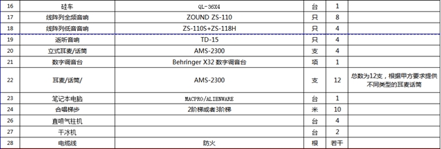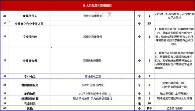 三、竞标项目要求 (一)资质要求: 1、报价商应为国内注册,具有独立承担民事责任的能力;具有良好的商业信誉且近两年来无不良销售记录,列入教育系统、卫生系统、检察院黑名单上的个人或公司;具有履行合同所必需的设备和专业技术能力。 2、具有视频拍摄制作以及音响舞美服务能力的公司。 3、本项目不接受任何形式的联合体申请人。 (二)其他:中标公司需提交设计终稿至招标方留档。 四、 商务要求: 1、具备专业剧目灯光编程技术能力、具备大型剧目灯光创作经验,能够较好的理解并独立执行导演的剧目创作思路的专业级灯光师。 2、具备专业剧目音响设计技术能力、具备剧目独立音频分轨技术能力、能够较好的理解并独立执行导演的剧目创作思路的专业级音响师。 3、投标人向采购人提供其要求的舞美设备、演出辅助服务,具体实物需采购人审查通过后使用。投标人提供的物料要保证所有场次正常演出,且与投标文件相符,否则采购人有权要求投标人限时整改。 4、电话咨询、成交供应商应当为采购人提供技术援助电话,解答采购人在使用中遇到的问题,及时为采购人提出解决问题的建议; 5、报价明显低于实际产生成本,恶意竞标的投标人,采购人有权取消其竞标资格。 五、报名资证材料 提供公司业绩、企业营业执照(三合一)、法定代表人授权书。 |