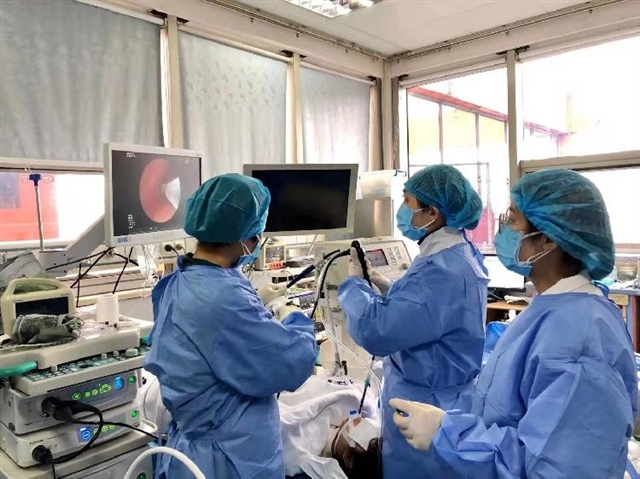 看到孩子还这么小,就备受主支气管狭窄的折磨,呼吸与危重症医学科王导新主任和李升锦教授都很心疼。因此在详细了解病史和检查评估后,他们据病人的病情、年龄,为小琪精心设计了一套治疗方案。在充分评估原发病及支气管腔内外情况后,由专研呼吸介入10余年、技术精湛的李升锦教授与介入小组成员共同合作,为患者实施冻融术打通闭塞+反复球囊扩张+局部冷冻治疗+局部注药治疗。