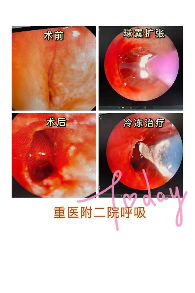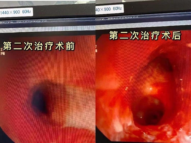 虽然对病情已经充分了解,但在手术时,李升锦教授还是没有想到患者左主支气管几乎已经完全闭合,有缝隙的地方只剩不到1mm左右,冷冻探头几乎过不去,让手术治疗陷入了非常困难的境地。为了最大程度地保护好患者的主支气管,李升锦教授只能采取反复冻融术一点一点地打通闭塞,打通闭塞后吸出大量白色脓性分泌物,然后逐渐增加压力行球囊支气管成形术,最后再慢慢进行冷冻治疗和局部注射药物,气管狭窄处也从不到1mm的缝隙扩开到了近8mm。为了打通这几毫米的生命通道,李升锦教授用了一个多小时,治疗结束后,后背都有点汗津津的。手术后,当小琪麻醉醒来后,感觉胸闷、呼吸不畅症状明显缓解,当天晚上,她睡了近期以来最香甜的一觉。