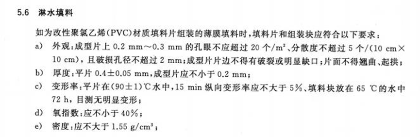 ①填料要求中:淋水填料氧指数≥32%,但此氧指数没有达 到国家淋水填料标准要求(国家淋水填料要求为:≥40%),中华 人民共和国 GB7190.2-2018 对淋水填料的氧指数有明确要求(截图附后)。