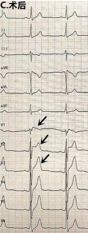 图1A:术前V1-V3导联Brugada波非常明显(箭头所示)