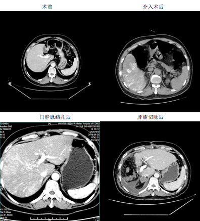 病情就是命令,迅速完成必要检查后,重庆市肝胆外科首席工作室领衔专家龚建平主任迅速主持了全科讨论。科室专家纷纷发言,金先生虽然癌灶较大较多,但局限于右肝,可先用介入控制疾病进展;左肝虽然较小,但患者脾脏不是特别大,提示肝硬化程度不是特别严重,如果结扎门静脉右枝后,左半肝脏可能有较强的再生能力,从而获得二期切除癌灶的机会的。最后大家拟定方案,由已经有多例此类手术经验的科室副主任刘作金教授主刀完成该手术。