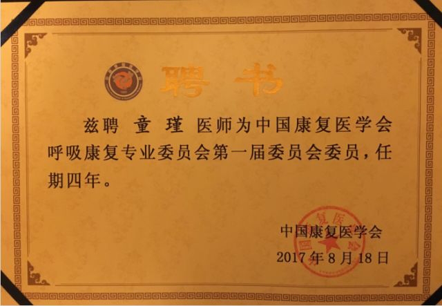 2.童瑾副教授被聘为“中国康复医学会呼吸康复专业委员会第一届委员会委员”;当选“中华医学会呼吸病学分会第十届委员会烟草病学组委员”