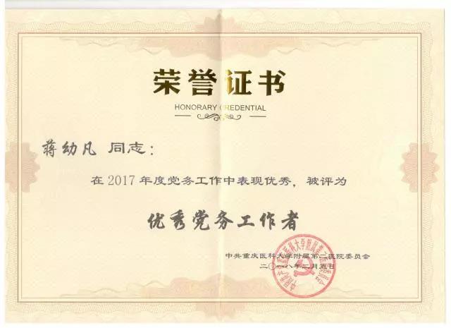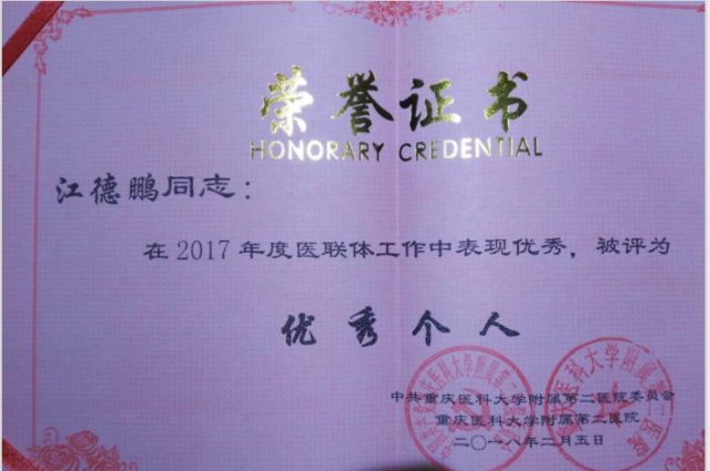 2.蒋幼凡教授2017年“优秀党务工作者”;江德鹏副教授被评为医联体工作“优秀个人”。