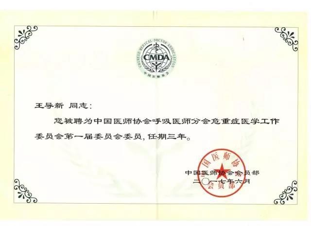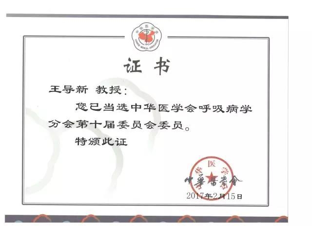 1.王导新教授再次被聘为中华医学会呼吸病学分会第十届委员会委员;中国医师协会呼吸医师分会危重症医学工作委员会第一届委员会委员