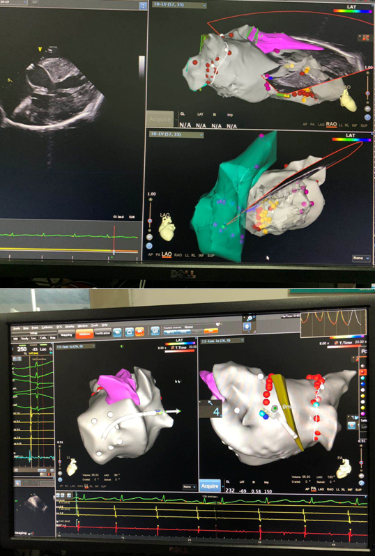 1月30日,由佘强教授、杜建霖副主任医师、邓松柏主治医师、刘亚杰博士组成的术者团队密切配合下,佘强教授、杜建霖副主任医师首先应用CartoSound三维系统解剖重建左房、室间隔;克服患者解剖严重变异CartoSound指导下完成房间隔穿刺,顺利完成环肺静脉电隔离术。之后CartoSound指导下精准定位消融引起流出道严重狭窄的室间隔部位。邓松柏博士完成心腔内压力检测,观察到即刻患者左室流出道压力阶差明显下降。术后患者症状明显缓解,第二天即可下床。