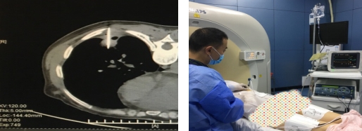 患者为外院确诊中晚期肺腺癌患者,来到我院后,经过基因筛查和仔细沟通,为患者选择了射频消融微创治疗+靶向治疗的综合治疗方案。江德鹏副教授经过充分准备,评估后于2018年4月25日21:00开始手术。手术医生于体表定位后将单极射频肿瘤消融电极针准确置入病灶中心部位,然后开始射频消融治疗[图二]。在治疗过程中,手术医生适时调整穿刺方向及深度,密切观察患者的反应及生命体征,整个手术耗时1小时左右,患者术中未诉任何疼痛。消融完毕行胸部CT扫描观察到明显晕轮征,未见明显气胸和出血等情况,术后三天患者好转出院。