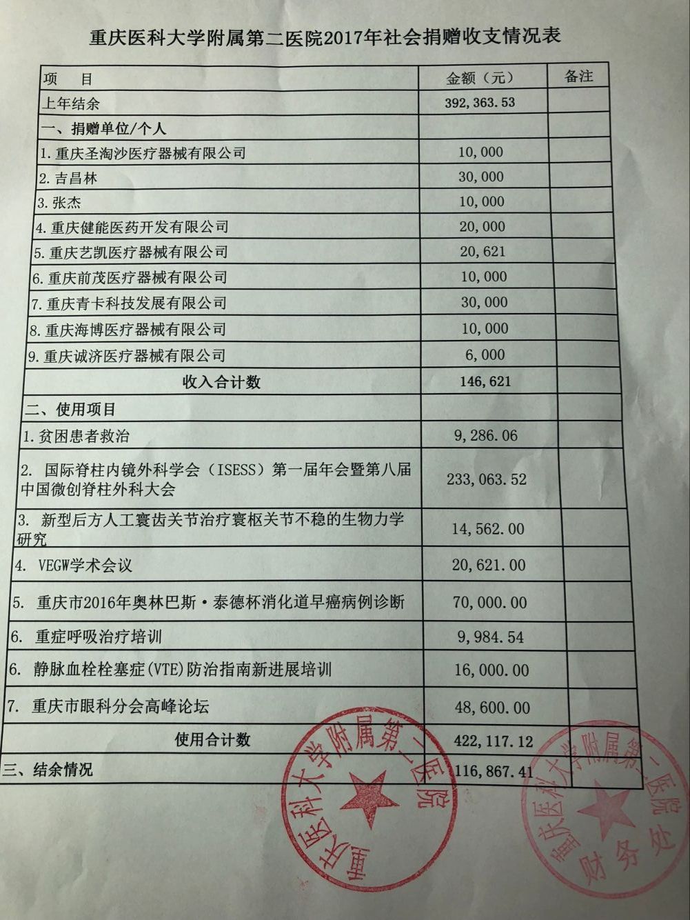 重庆医科大学附属第二医院2017年社会捐赠收支情况表