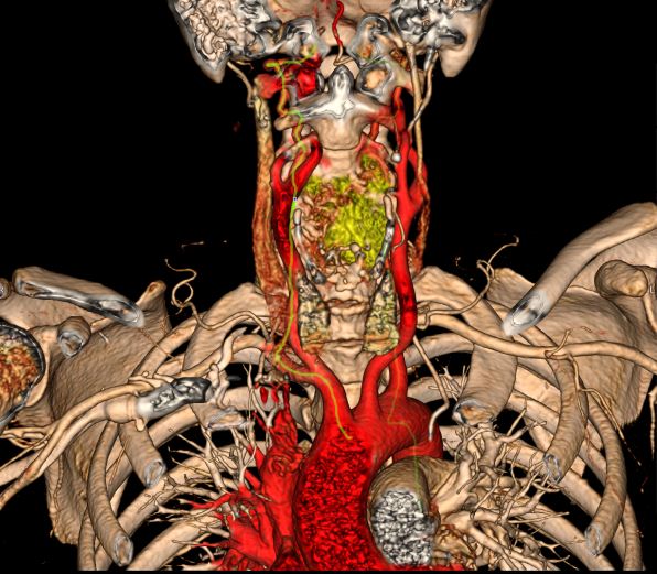 (术前CTA成像,红色为血管,黄色为肿瘤组织)