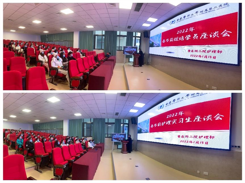 值此新春佳节来临之际,为切实做好疫情防控工作,强化学生安全风险防范,狠抓各项措施落实,确保学生度过欢乐、安全、祥和的节日,我院护理部于2022年1月13日下午,在江南院区阶梯会议室和渝中院区门诊8楼学术报告厅同步召开了“2022年春节前规培生和实习生座谈会”。护理部副主任罗玲教授、护理部干事郑秋兰、边彩虹及全体护理学生代表约150余人参加了此次座谈会。会议由罗玲副主任主持,为减少人员聚集,此次会议分批次分时段进行,即规培生座谈会和实习生座谈会分别召开。