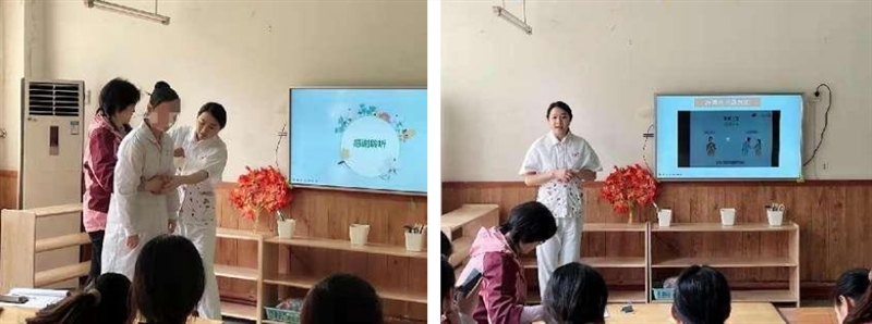 活动过程中,志愿者通过图片、视频形象生动地为童乐坊幼儿园的老师讲解了鱼刺卡喉、鼻出血及海姆立克急救法的相关知识。纠正鱼刺卡喉及鼻出血的一些处理误区,讲解安全、正确的处理方法,示范如何进行口咽部的检查,如何有效捏鼻;最后进行答疑解惑,进行健康的生活指导。活动现场气氛活跃,老师们积极参与互动,主动学习小儿、成人、肥胖者海姆立克急救法的实施要点并进行真人演练。