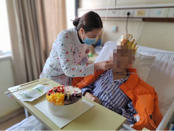 意外得知今天是张老爷子八十大寿后,管床护士对爷爷说生日快乐,爷爷说“快乐啥子哟!”。老爷子心想我的八十大寿竟然是在医院度过,一点都不热闹。但他不知道的是我们在李主任和杜清清护士长的安排下悄悄进行了周详的准备,有鲜花、蛋糕等,就想给老寿星过一个简单温馨又特殊的生日,增加他康复的信心,让他感受如家庭般的温暖。大家围绕在寿星床边,对着蛋糕唱生日歌,吹蜡烛,祝他生日快乐,早日康复。问老爷子的生日愿望是什么时,老爷子中气十足的说到:我要活到100岁。管床护士现在问到:爷爷你现在开心了不?爷爷说:快乐快乐哦!张老爷子和家属都十分开心,爷爷感激地说:“真是太感谢你们了,真没想到我还能这么过我的八十大寿”。爷爷术后康复非常顺利,现已康复出院,迫不及待的回家过年了。