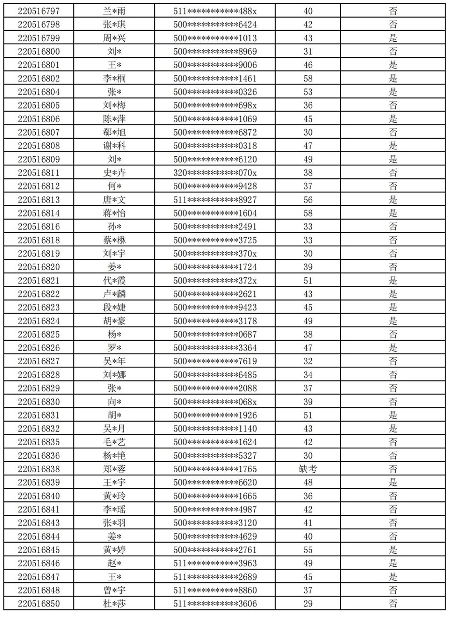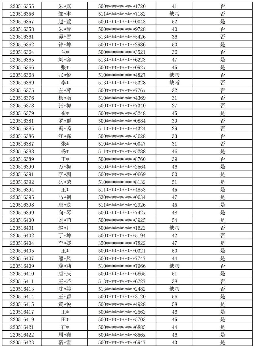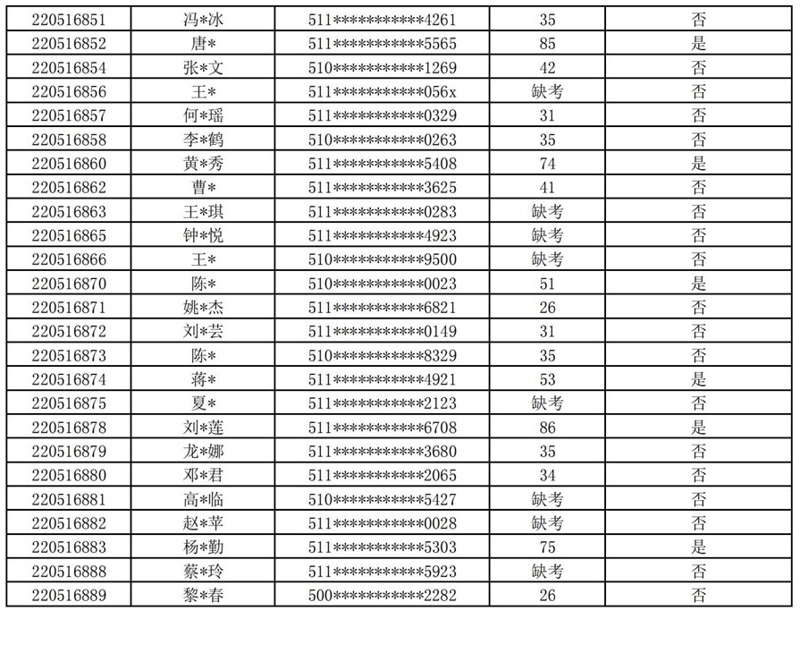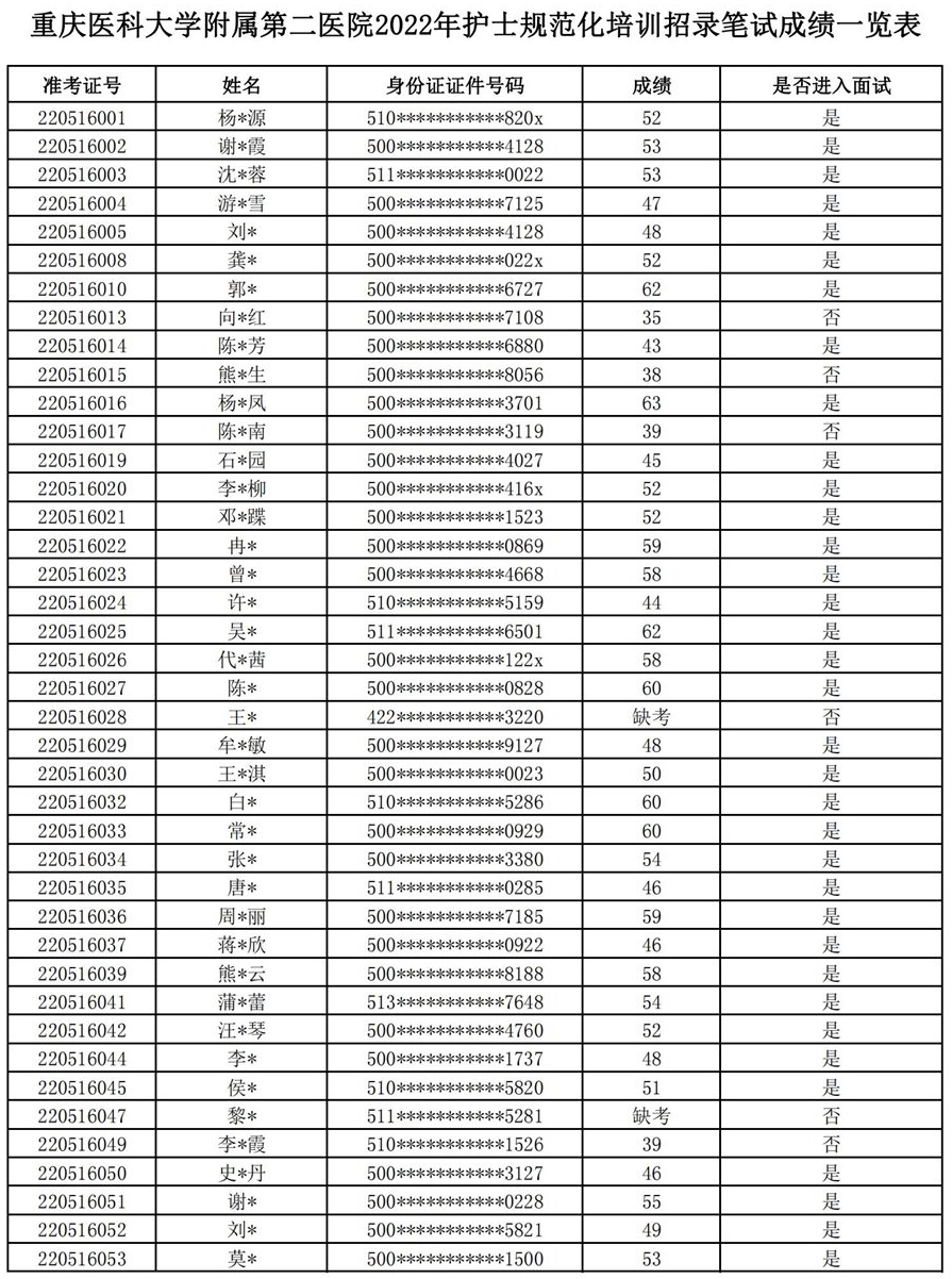 重庆医科大学附属第二医院2022年护士规范化培训招录笔试成绩一览表