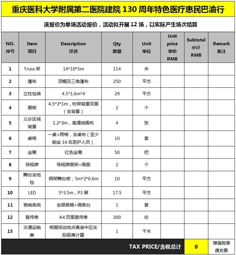 活动 执行 | 场地 | 包括场地协调、活动棚房搭建、舞台搭设、宣传展板搭建、LED屏幕搭建、桌椅放置、电路等设施协调等 | |
