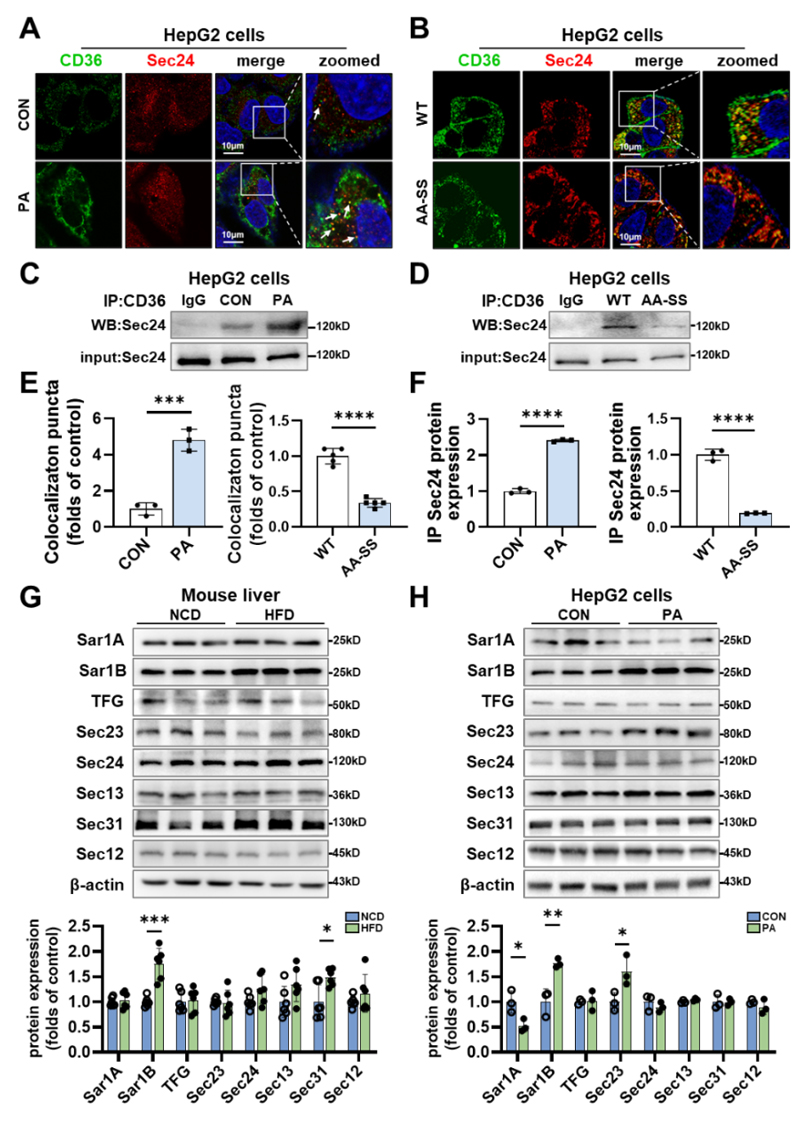 为了探索CD36 在细胞内转运的可能机制,研究人员通过免疫荧光和蛋白质免疫共沉淀技术发现喂食HFD小鼠肝脏中CD36与Sec24的结合增多。而抑制CD36棕榈酰化可以减少CD36进入COPII囊泡并改善小鼠肝脏损伤。研究人员随后检测了COPII形成过程中各组分变化,发现Sar1B在喂食HFD的小鼠肝脏和体外脂肪酸刺激下表达升高。SelK作为维持内质网相关蛋白稳态的重要分子,可以上调Sar1B的稳定性并促进Sar1B与其激动分子Sec12结合,触发新生COPII囊泡的形成从而加速CD36离开内质网。