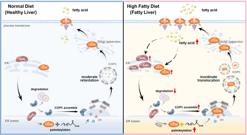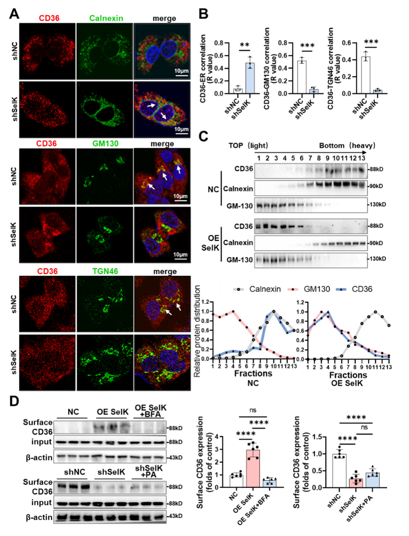 研究人员在喂食高脂饮食(HFD)的小鼠肝脏中观察到CD36在高尔基体和细胞膜中的分布增多,同时SelK表达水平显著增加。增加SelK可促进CD36向高尔基体和细胞膜转移,而降低SelK则使得CD36“滞留”在内质网中。此外,研究人员通过分析CD36在细胞膜的分布情况以及脂肪酸结合摄取功能发现SelK可通过影响CD36亚细胞定位参与调节CD36的脂肪酸摄取活性。