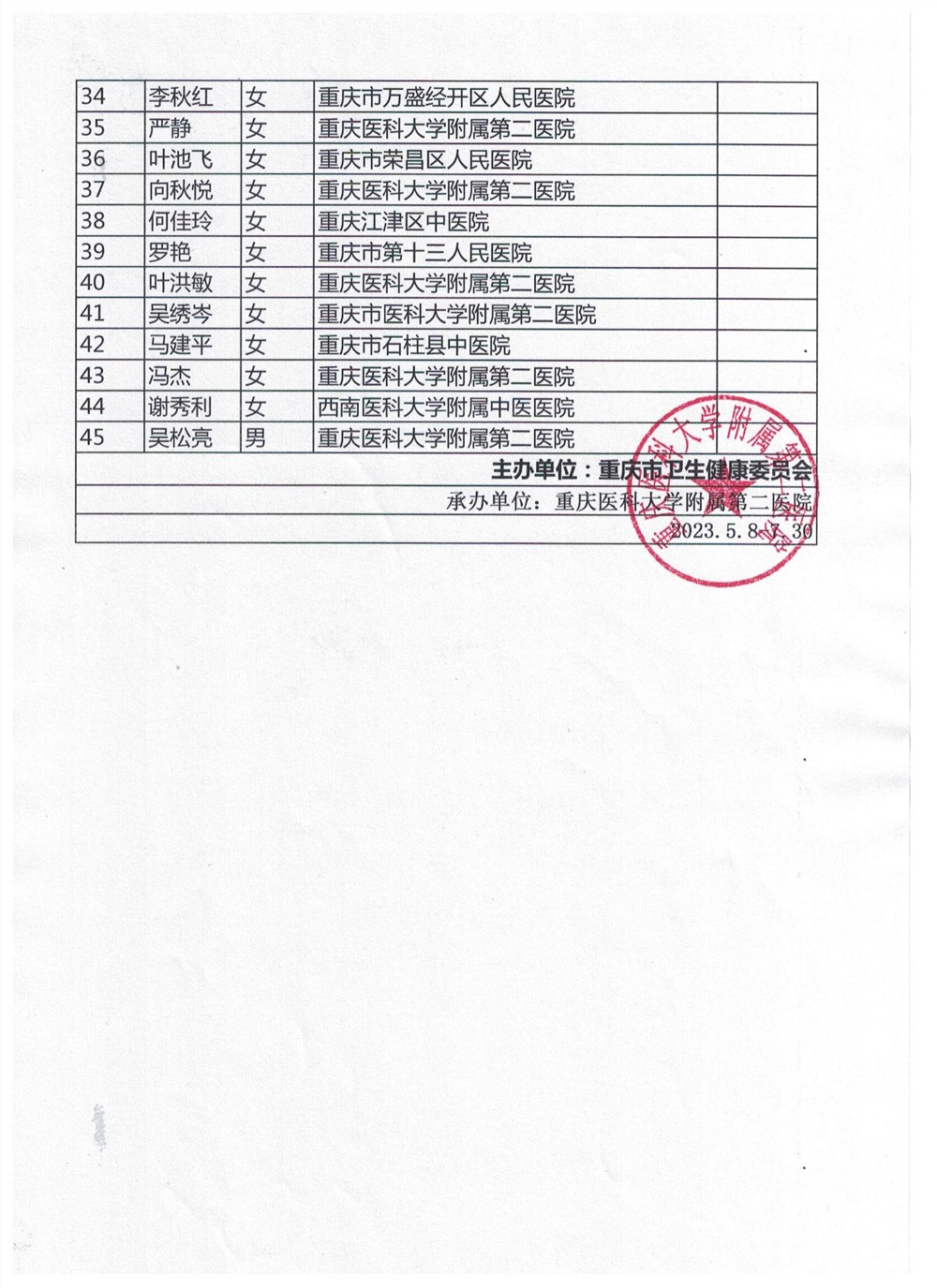 重庆市第九期呼吸专科护士班录取名单